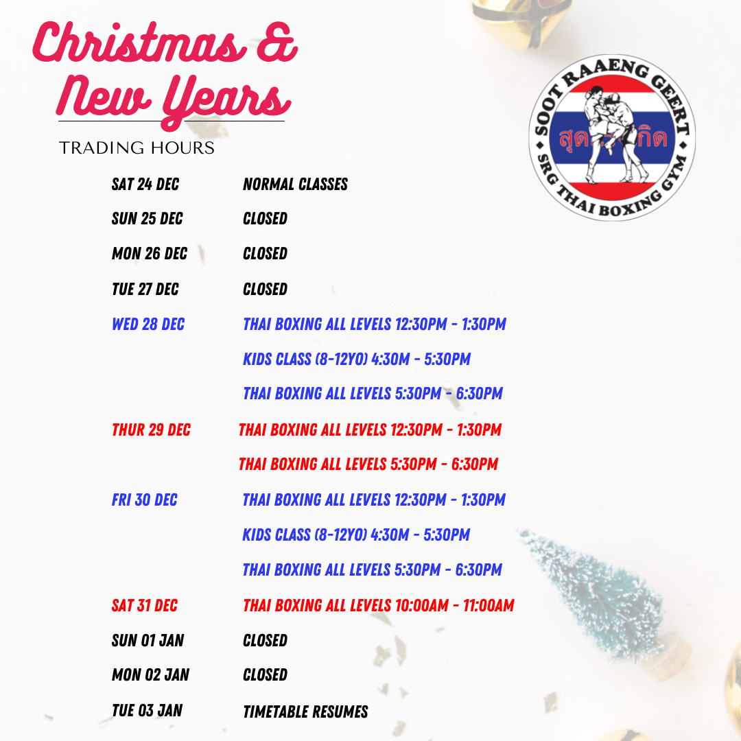 30/12 Thai boxing all levels 12:30pm – 1:30pm | Kids class (8-12yo) 4:30pm – 5:30pm | Thai boxing all levels 5:30pm – 6:30pm